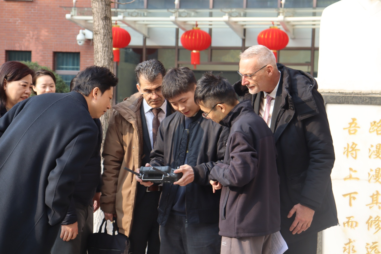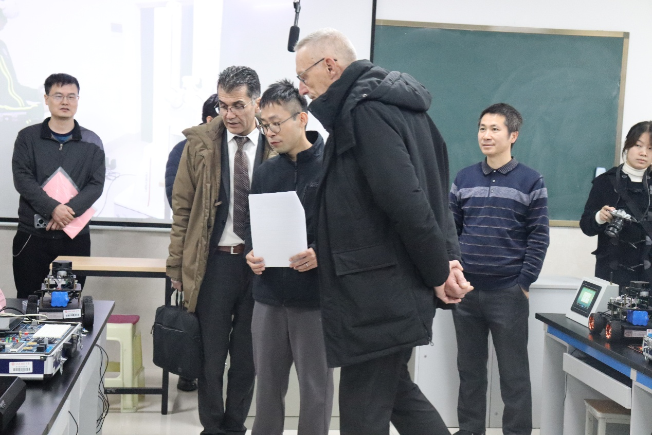 活动第一阶段,代表团在中和楼前坪参观了智能驾驶设备与无人机项目。邵展鹏介绍了自动驾驶技术并进行了现场演示,韦晓辉展示了无人机应用。随后,代表团前往学院四楼,依次参观了具身智能机器人、四足机器狗、群控小车机器人等多个前沿实验室,以及学生创新成果展示区。在模块化机房,娄小平演示了光量子计算原型机,介绍了学院的算力支撑情况。