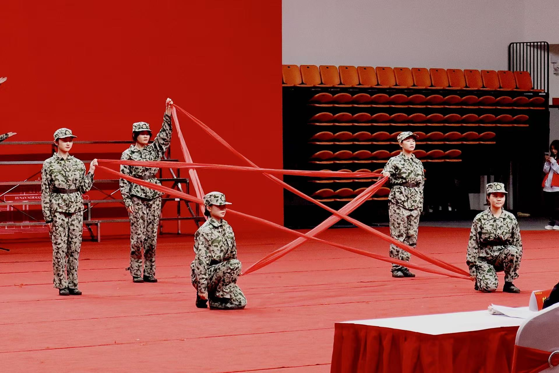 合唱团成员以红绳巧构五角星