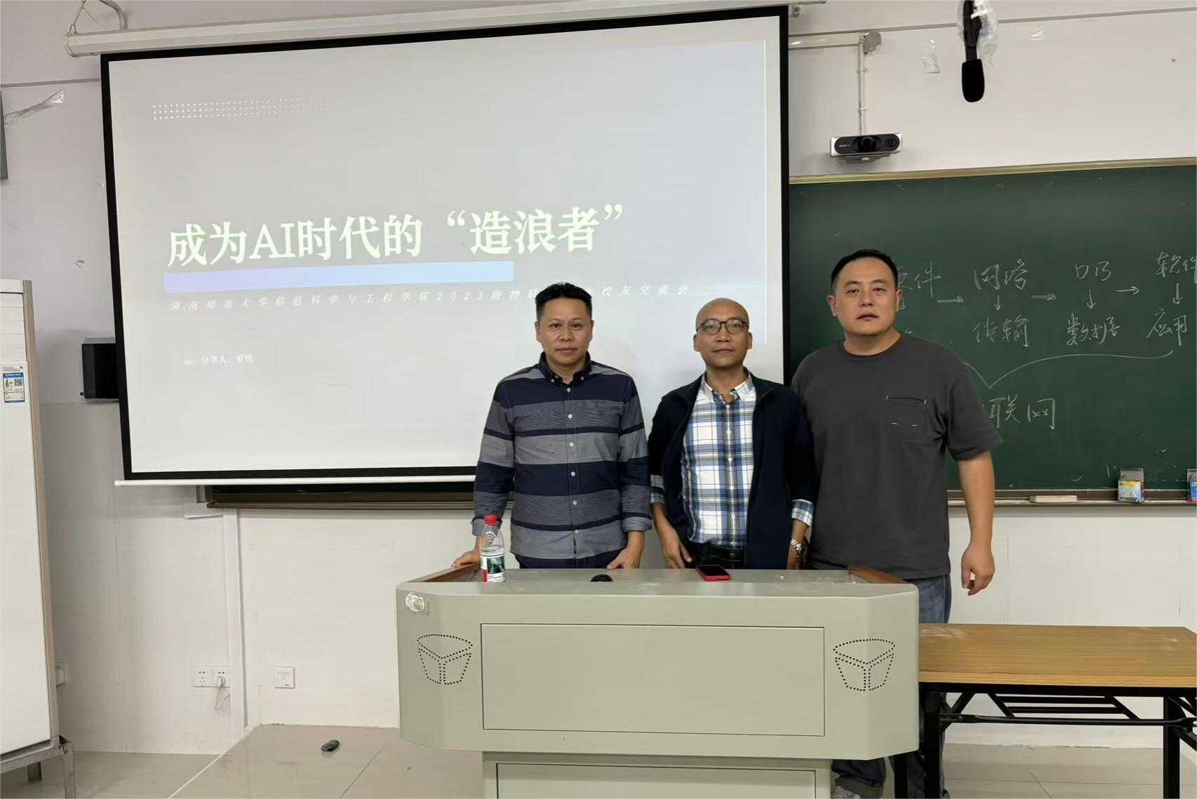分享会上,罗伟以 “成为 AI 时代的‘造浪者’” 为核心主题,结合自身丰富经历展开分享。他从 “关于我” 的视角切入,坦诚回顾职业历程:曾任职芒果超媒娱乐互动产品经理,主导快男快女投票系统、虚拟偶像互动系统等星粉互动产品开发;后担任蓝思科技智能制造项目经理,打造工业互联网平台 MES 定制化系统、智慧工厂数字孪生平台等多个智能制造项目;同时,他作为 “自我折腾永不言败的创业者”,还搭建了食品安全培训平台、水务行业技能培训平台,并成为湖南省人工智能协会首批会员,参与开发国内首批 ChatGPT 套壳系统与 Suno 套壳系统。基于这些实践,罗伟提炼出 “血泪心得”—— 当代学子需努力成为打通技术与商业、连接虚拟与实体、兼具逻辑与共情的 “T 型人才”,为同学们的能力培养指明方向。
