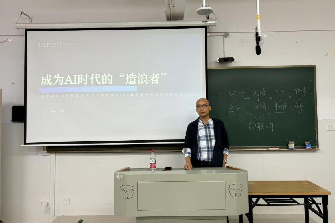 (方诗语 栗在恒)10 月 17 日下午 ,我院2023 级物联网工程班在中和楼 328 教室举办校友经验分享会。本次分享特邀校友导师、蓝思科技副总经理罗伟主讲,院党委副书记周劲松与2023 级辅导员肖笛莅临参观,2023 级物联网工程班全体同学参与,共同聚焦 AI 时代的成长机遇与发展路径。