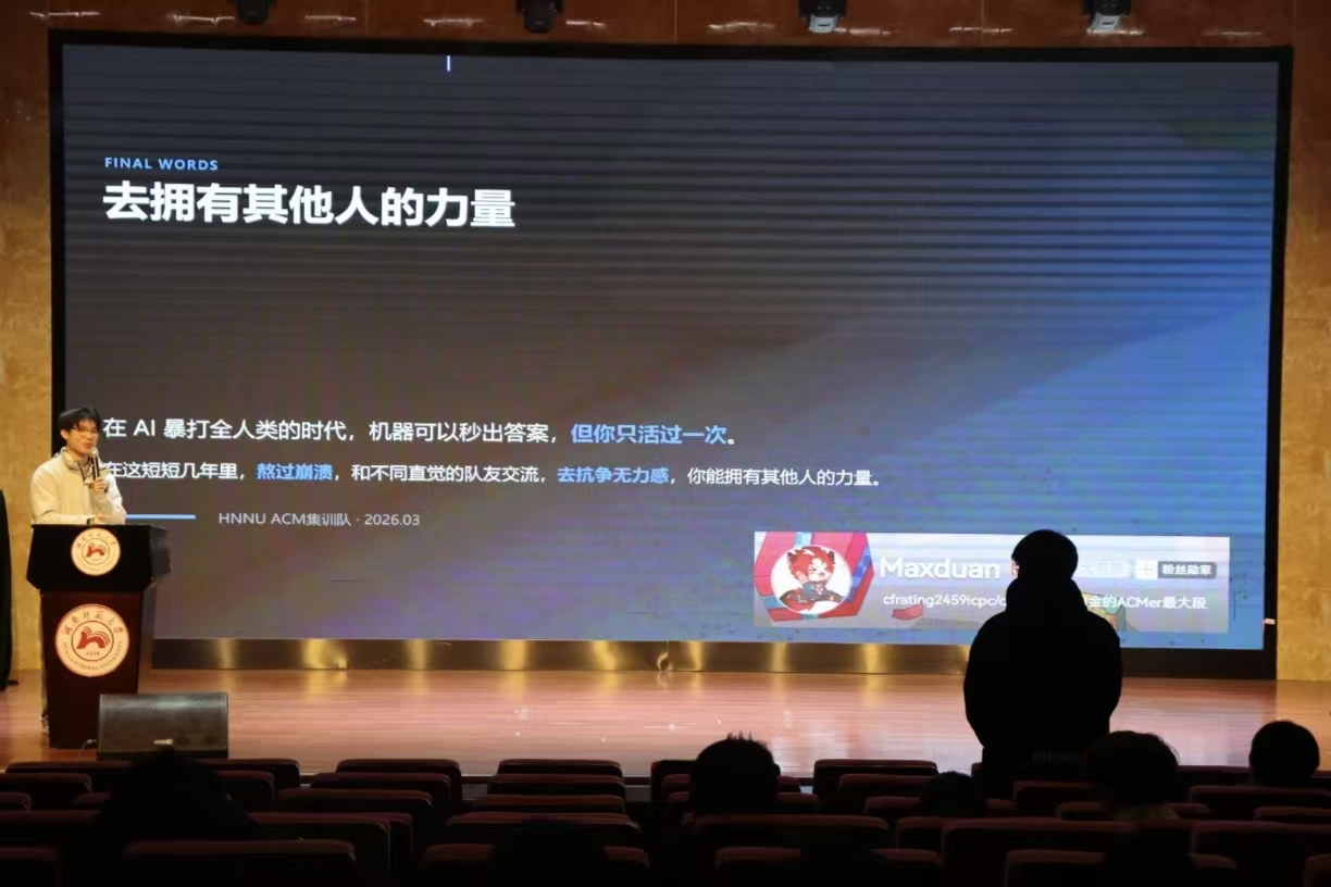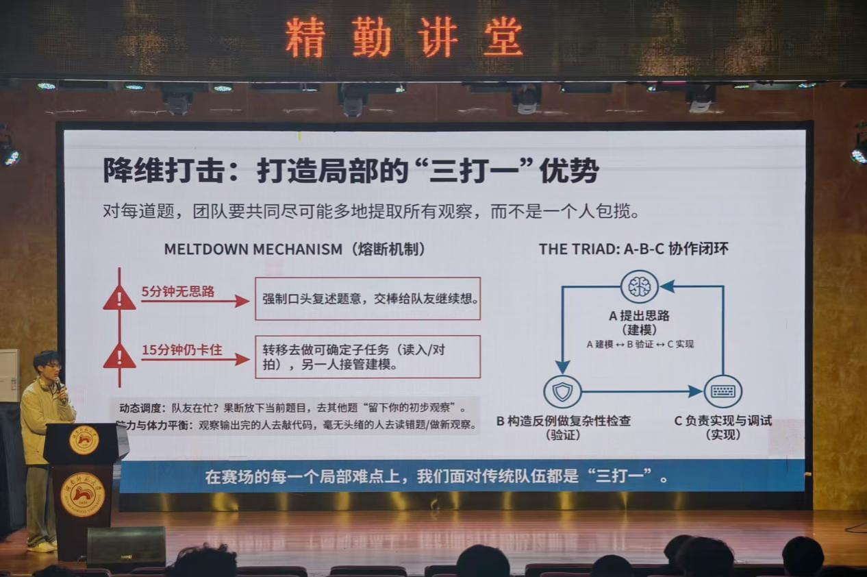段天琦详细阐述了算法竞赛的核心价值,分析了主流赛事的赛制特点与获奖现状,以深入浅出的方式介绍了算法竞赛的备赛策略,涵盖基础训练、团队协作等环节。同时,他分享了算法竞赛中常用的训练方法论,并推荐了一系列优质学习资源与实战平台,为感兴趣的同学提供了清晰的进阶指引。段天琦还结合自身参赛的心路历程和收获,讲解了算法竞赛的实用价值与诸多优点,着重强调团队协作中分工明确和保持信心的重要性,鼓励同学们勇于尝试,大胆创新,积极参与算法竞赛,锻炼自身的实践能力。
