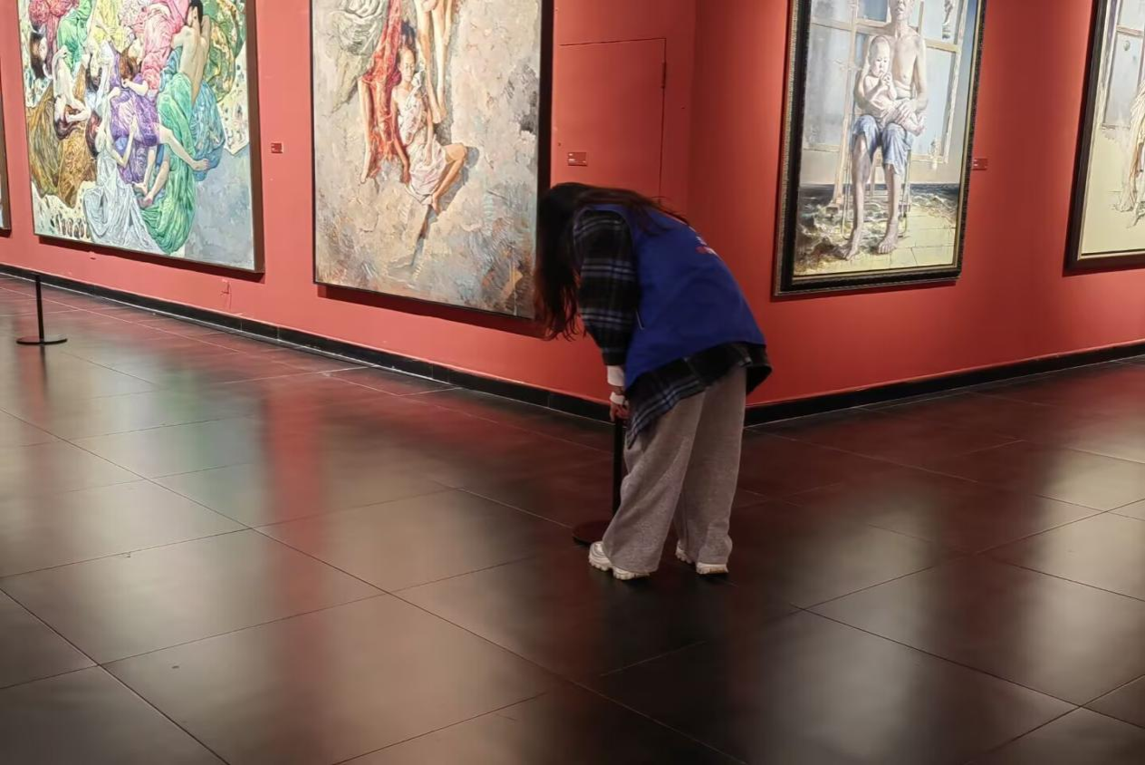 活动期间,志愿者们主要承担美术馆的日常秩序维护与参观引导工作。在展厅内,志愿者们密切关注参观情况,礼貌提醒观众遵守观展规范,引导大家不触摸展品、不跨越警戒线,避免艺术作品遭受意外损伤;同时提醒观众不携带气味较大的食品入场,全力维护展厅环境整洁。在入口区域,志愿者们积极配合场馆管理要求,认真开展扫码核验工作,同时为老人、孕妇等特殊群体提供便利服务。此外,部分志愿者还协助完成了画展前期的场地布置等工作,为活动顺利开展提供保障。