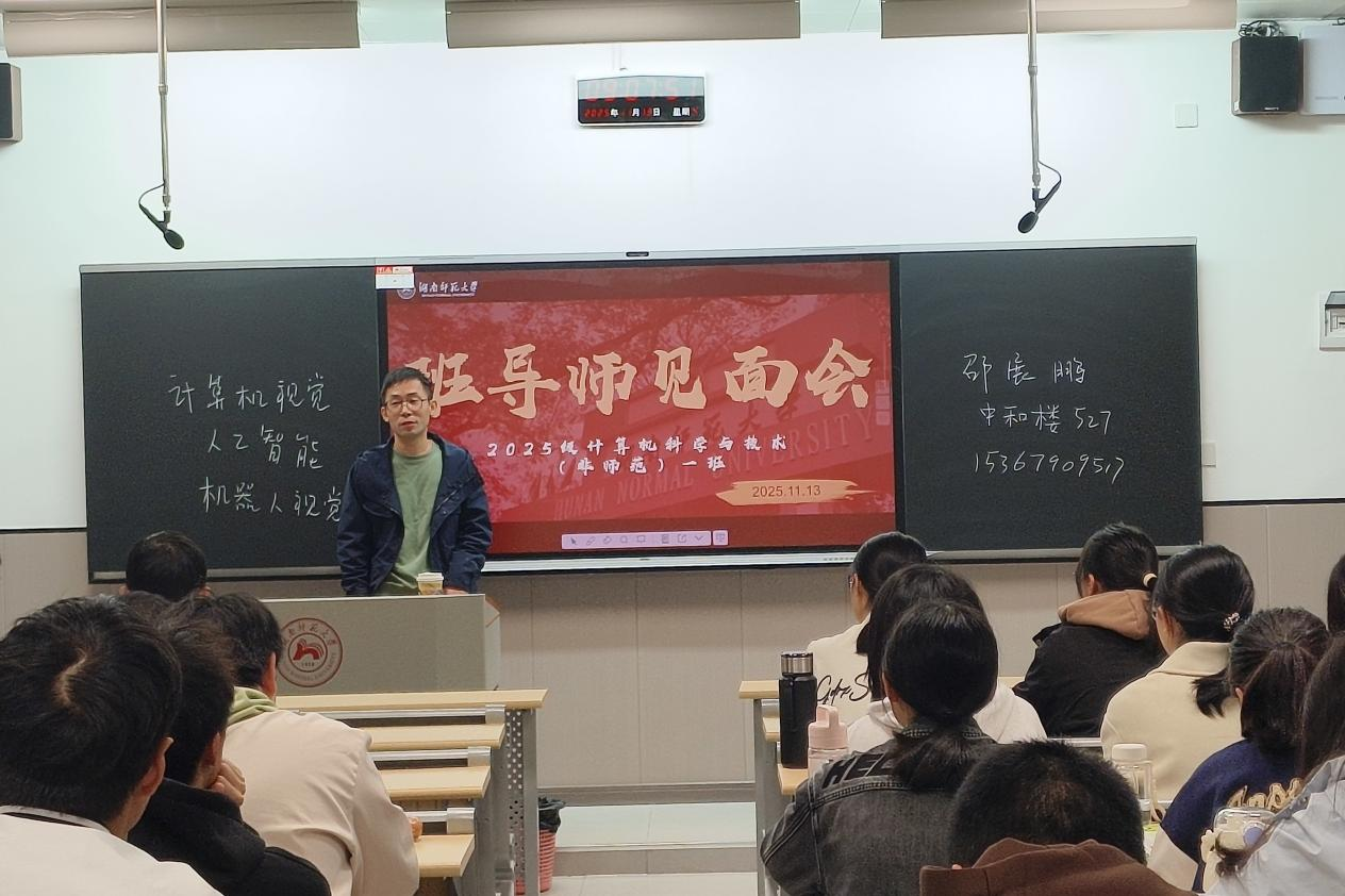 班导师与新生首次见面(通讯员 张依萌)11月13日上午,2025级计算机科学与技术(非师范)一班在教室举办了班导师见面会。班导师邵展鹏与全体同学齐聚一堂,围绕专业学习、研究方向及未来规划等方面展开了深入交流。见面会伊始,邵展鹏首先进行了简要的自我介绍,并对本学期的课程安排作了系统说明。他特别提醒同学们要关注教学进程计划表,合理规划学习进度。同时,邵展鹏还向同学们展示了他的主要研究领域,涵盖计算机视觉、人...